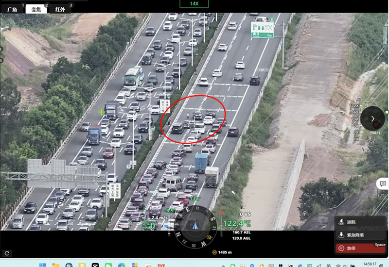 例如,10月1日14時56分,大有園立交松山湖收費(fèi)站無人機(jī)發(fā)現(xiàn)莞深高速-G94公路形成擁堵,無人機(jī)快速前出核查擁堵原因。14時58分,無人機(jī)發(fā)現(xiàn)擁堵源頭“快速路四車碰撞,導(dǎo)致道路擁堵”,并同步將事件發(fā)生位置、事件類型等信息發(fā)送至高速公路信息服務(wù)中心(指揮中心)進(jìn)行救援處置力量的調(diào)度指揮。14時59分,無人機(jī)前出至事件發(fā)生地上方,懸停飛行進(jìn)行疏導(dǎo)喊話,持續(xù)提示后續(xù)車流減速行駛并向右規(guī)避。